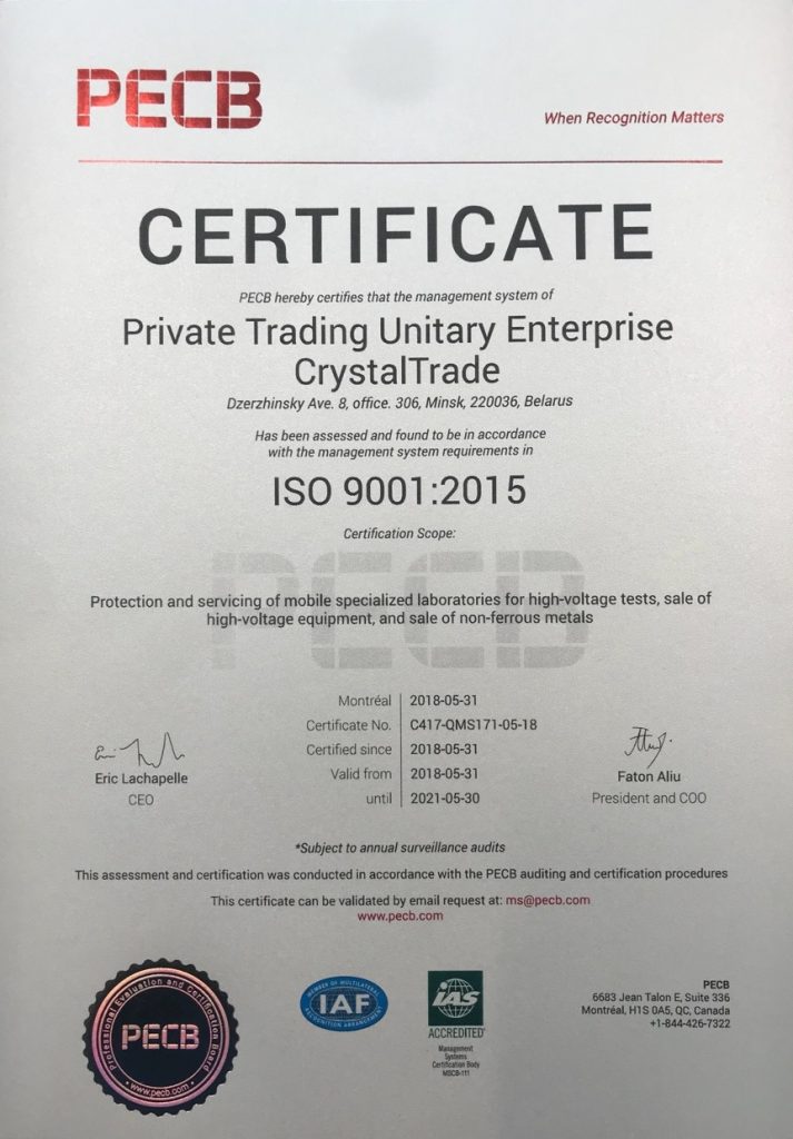 Система менеджмента качества в области производства и сервисного обслуживания Лабораторий высоковольтных испытаний была оценена центром сертификации PECB и признан соответствующей с требованиями ISO 9001:2015.